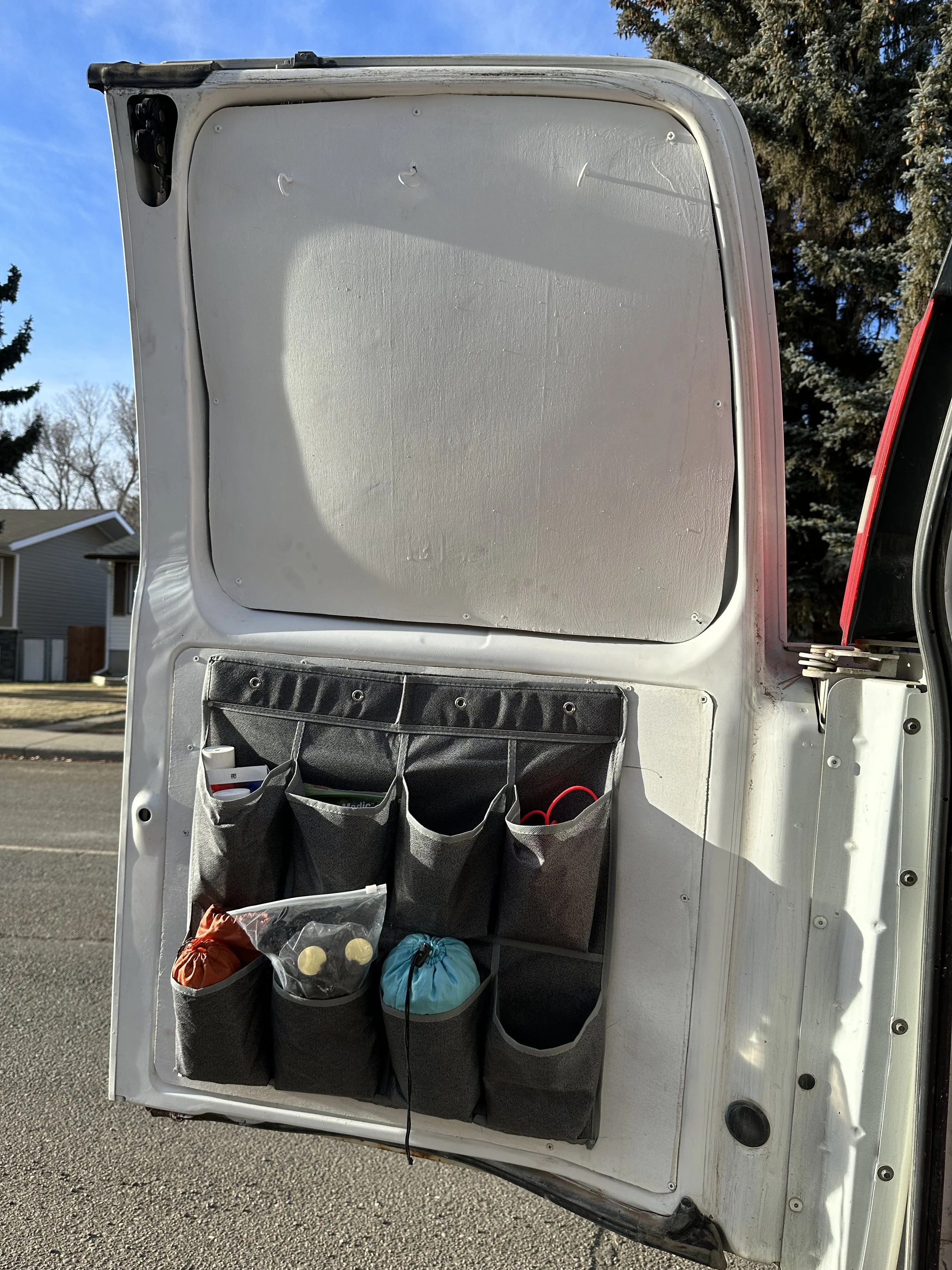 I used closet shoe storage for gear storage on the back doors.
